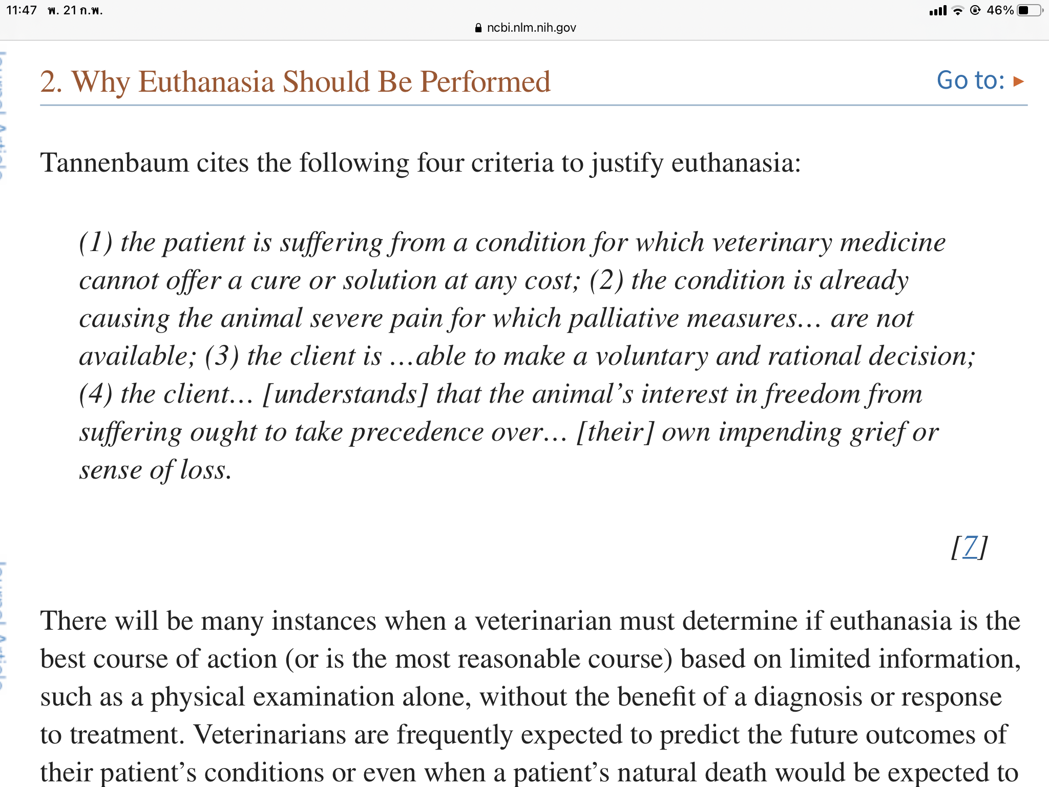 - สัตว์ มีการทรมาณอย่างมาก หรือเจ็บปวดมากจากโรคหรือสภาพที่ไม่สามารถรักษาได้ หรือ ไม่ตอบสนองต่อการรักษา รักษาอย่างไรก็ไม่ดีขึ้น มีแต่ทรงหรือทรุด ยกตัวอย่างเช่น โรคมะเร็ง แขนขาหักแบบรุนแรง สมองตาย การชักแบบที่ไม่ตอบสนองต่อยา